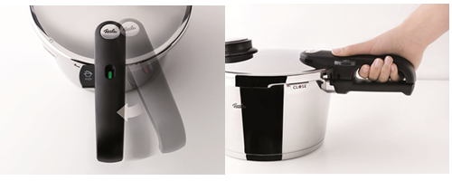 Ett ”klick” och en grön display visar att tryckkokaren är ordentligt stängd. Först då kan trycket höjas. vitavit® premium är försedd med ett säkerhetshandtag för att undvika att man bränner sig eller slinter när händerna är blöta.